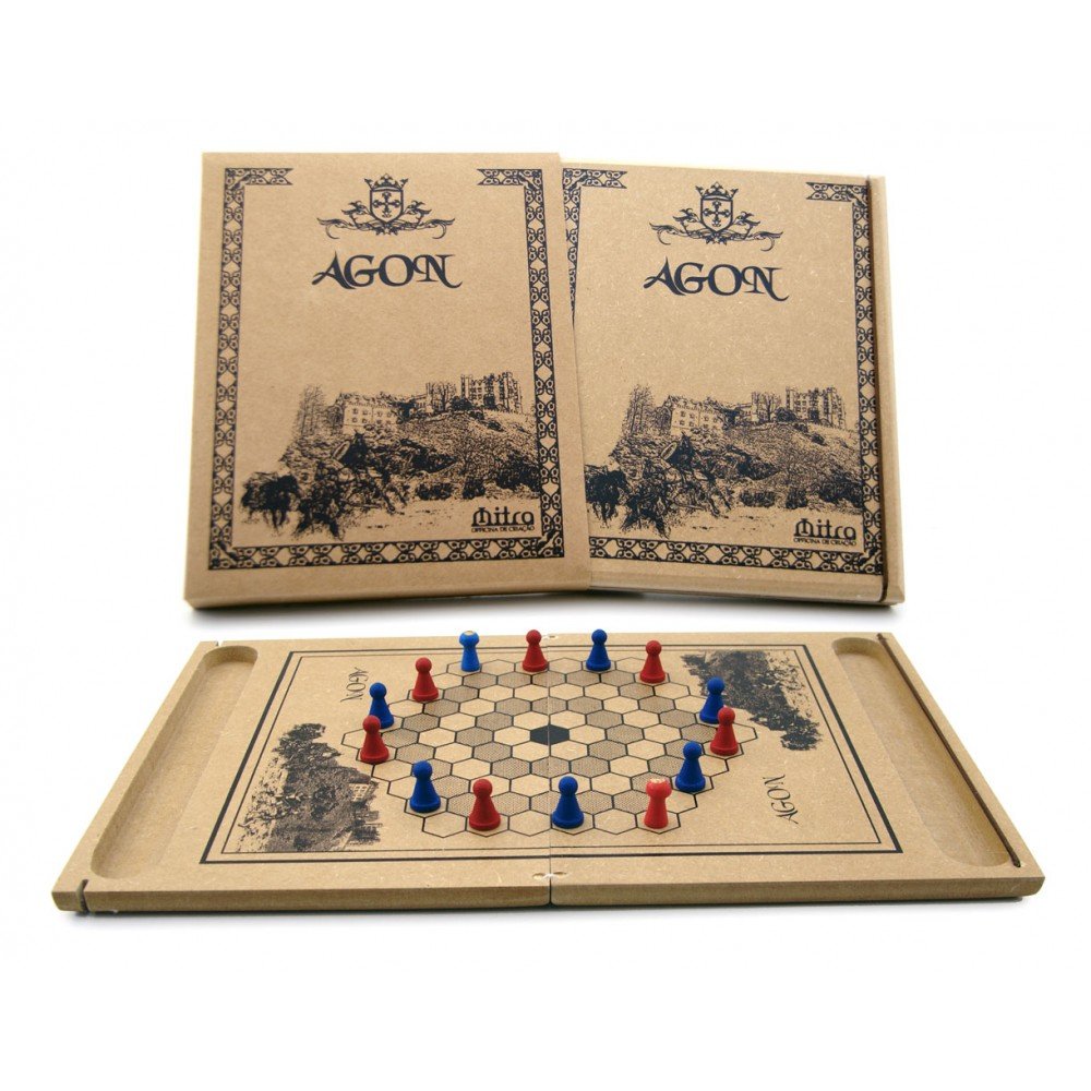 A origem de Agon é um pouco misteriosa. Datada do Século XVIII, o primeiro tabuleiro que se tem notícia foi encontrado em um tampo de mesa francês, produzido pelo parisiense Adan Vaugeois em 1780. Após um período de esquecimento, o jogo reaparece, quase um século depois, durante a era Vitoriana. Agon também é conhecido como Guarda Real, ou Guarda da Rainha (The Queen’s Guard). O jogo lembra um pouco do Tablut pela presença de uma casa central chamada de “O Trono” e o tipo de peças usadas (Rei / Rainha e Guarda); no entanto, curiosamente oposto ao Tablut, o trono é o objetivo da Rainha. A forma do tabuleiro é a principal característica deste jogo sendo que é o primeiro jogo, que se tem notícia, a usar o padrão hexagonal nas casas do tabuleiro. Agon é um jogo que pode ser considerado como uma mistura entre batalha e corrida. Cada jogador tem seis guardas e uma rainha e tem por objetivo levar a sua rainha para o centro do tabuleiro com a ajuda de seus guardas.