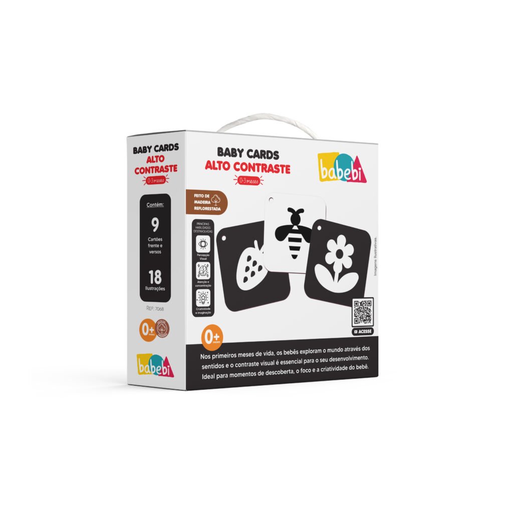Os “Baby Cards Alto Contraste – Babebi” são cartões sensoriais desenvolvidos para estimular a visão dos bebês nos primeiros meses de vida. Com desenhos em preto e branco de alto contraste, eles ajudam no desenvolvimento visual e cognitivo do bebê de forma lúdica e envolvente.
