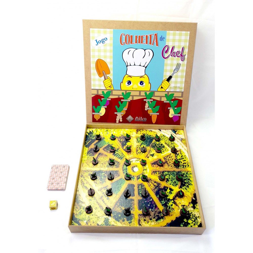 Conteúdo do jogo: Tabuleiro em MDF com impressão colorida de uma horta; 36 peças em formato 3D de legumes e verduras; 1 dado; 25 cartinhas com receitas.