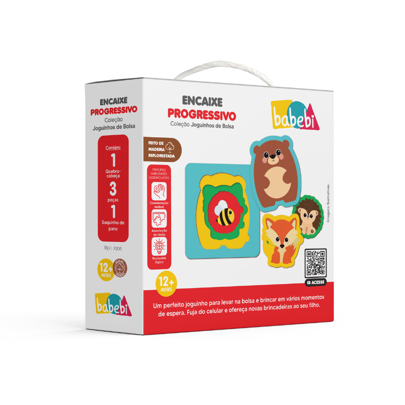O Encaixe Progressivo é um joguinho educativo que convida a criança a montar as peças em sequência, do maior para o menor, estimulando a observação e a coordenação. Compacto e prático, é ideal para levar na bolsa e transformar momentos de espera em aprendizado divertido.