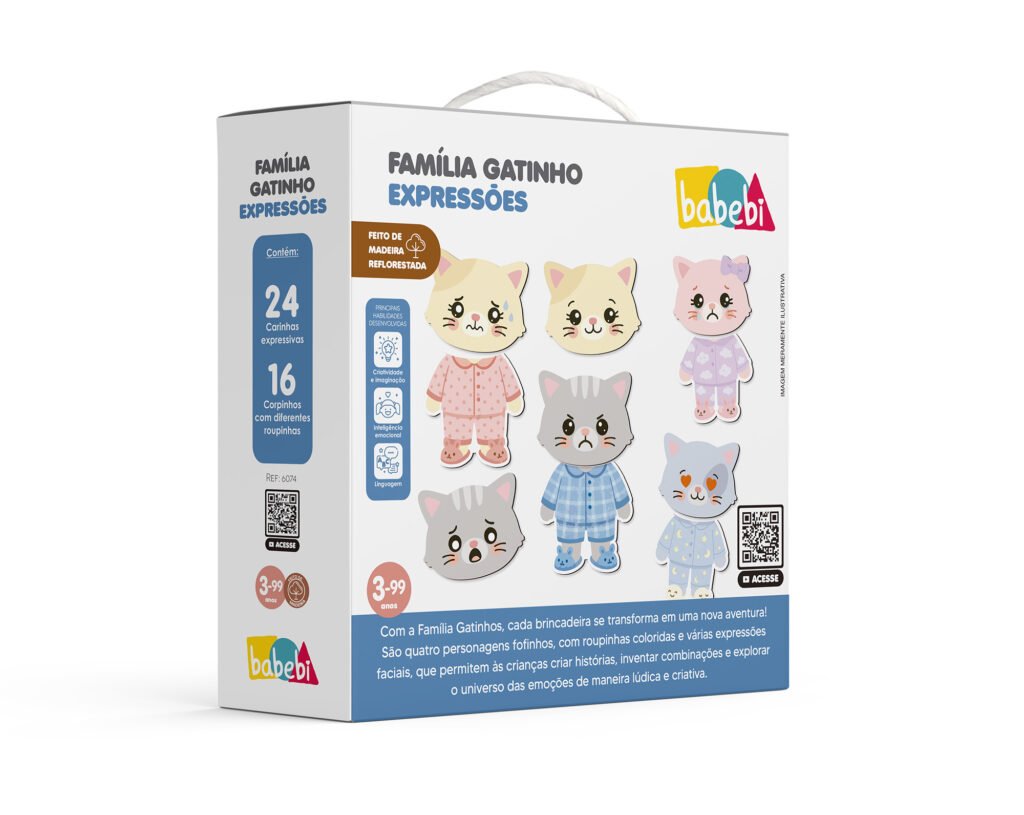 A Família Gatinho – Expressões é um brinquedo criativo que convida as crianças a explorarem o universo das emoções de forma lúdica e divertida. Com personagens fofinhos, roupinhas coloridas e diversas expressões faciais, os pequenos podem montar combinações, criar histórias e dar vida a diferentes situações do dia a dia.
