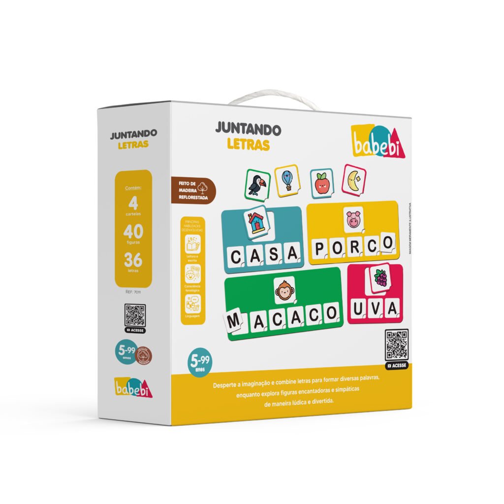 Contém 4 cartelas, 40 figuras, 36 letras. Indicado para crianças a partir de 5 anos.