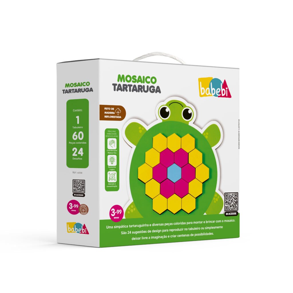 Uma simpática Tartaruguinha e diversas peças coloridas para montar e brincar com o mosaico. São 24 sugestões de design para reproduzir no tabuleiro ou simplesmente deixar livre a imaginação e criar centenas de possibilidades. Trabalha o raciocínio lógico, atenção, concentração de maneira lúdica e criativa.