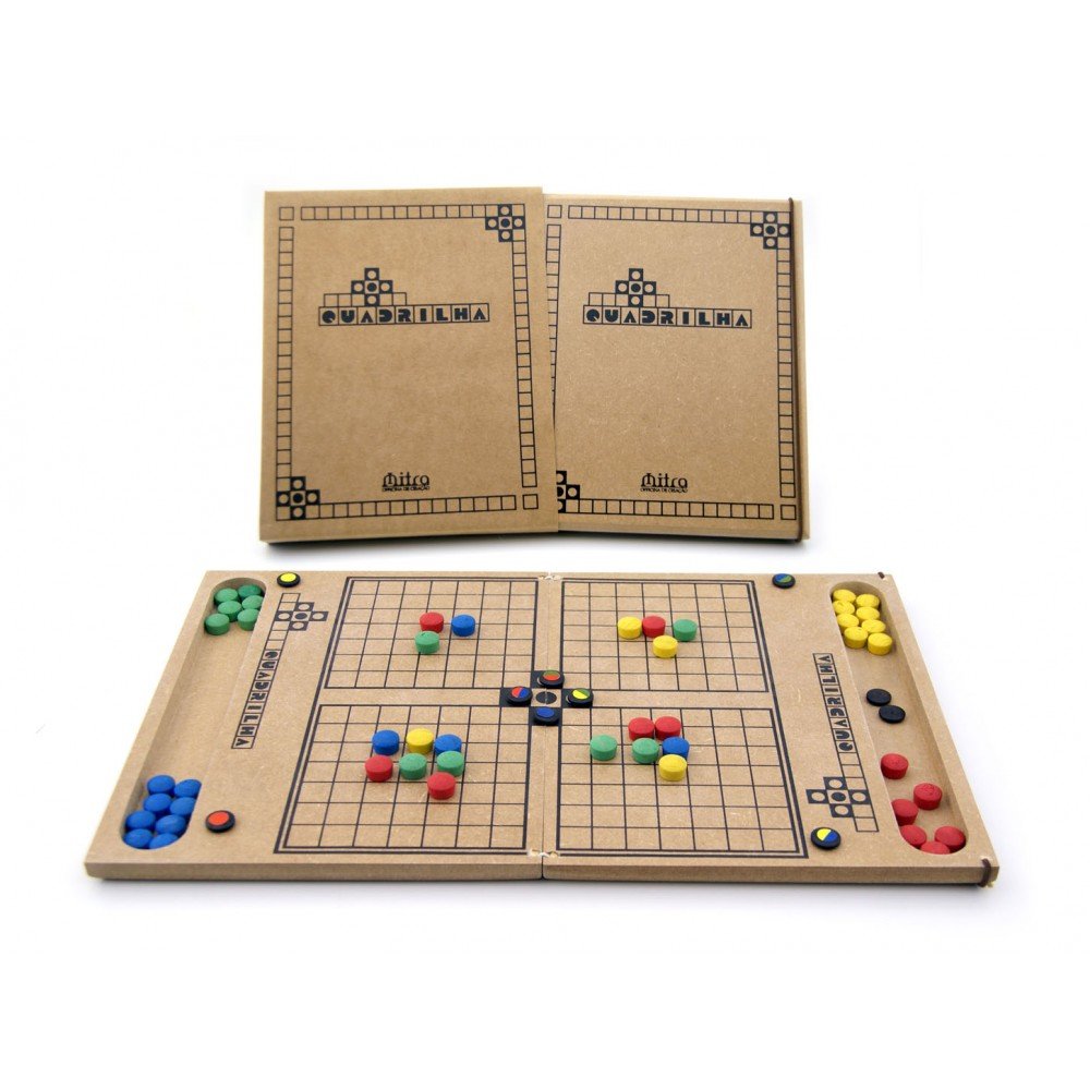 Contém: 1 tabuleiro em MDF 10 peças em madeira pretas com indicações de cores 48 peças em madeira sendo 12 amarelas, 12 vermelhas, 12 azuis e 12 verdes folheto com regras e instruções para jogar.