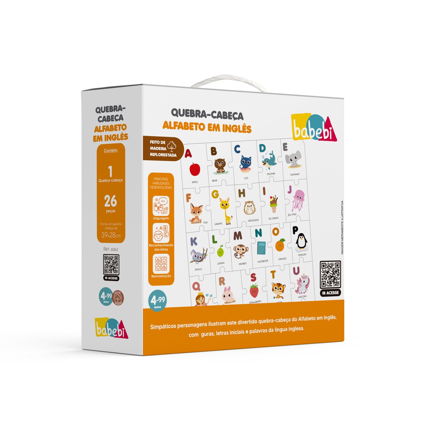 Contém 01 quebra-cabeça medindo 39x28cm com 26 peças que representam o alfabeto e ilustrações em inglês.