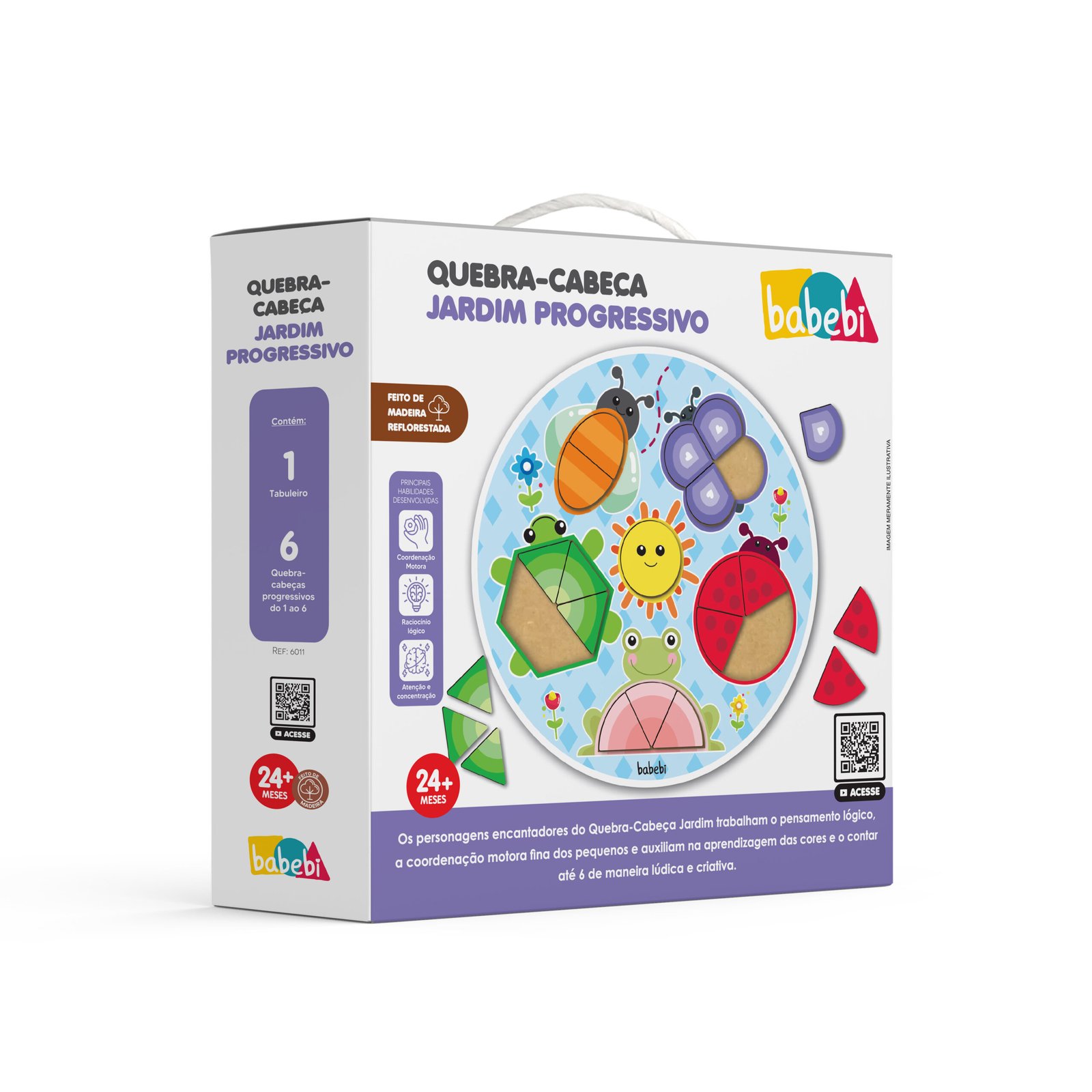 O Quebra-Cabeça Progressivo Jardim trabalha o pensamento lógico, coordenação motora fina, orientação espacial, associação de ideias, as partes e o todo dos animais, as cores e o contar até 6 de maneira lúdica e criativa.