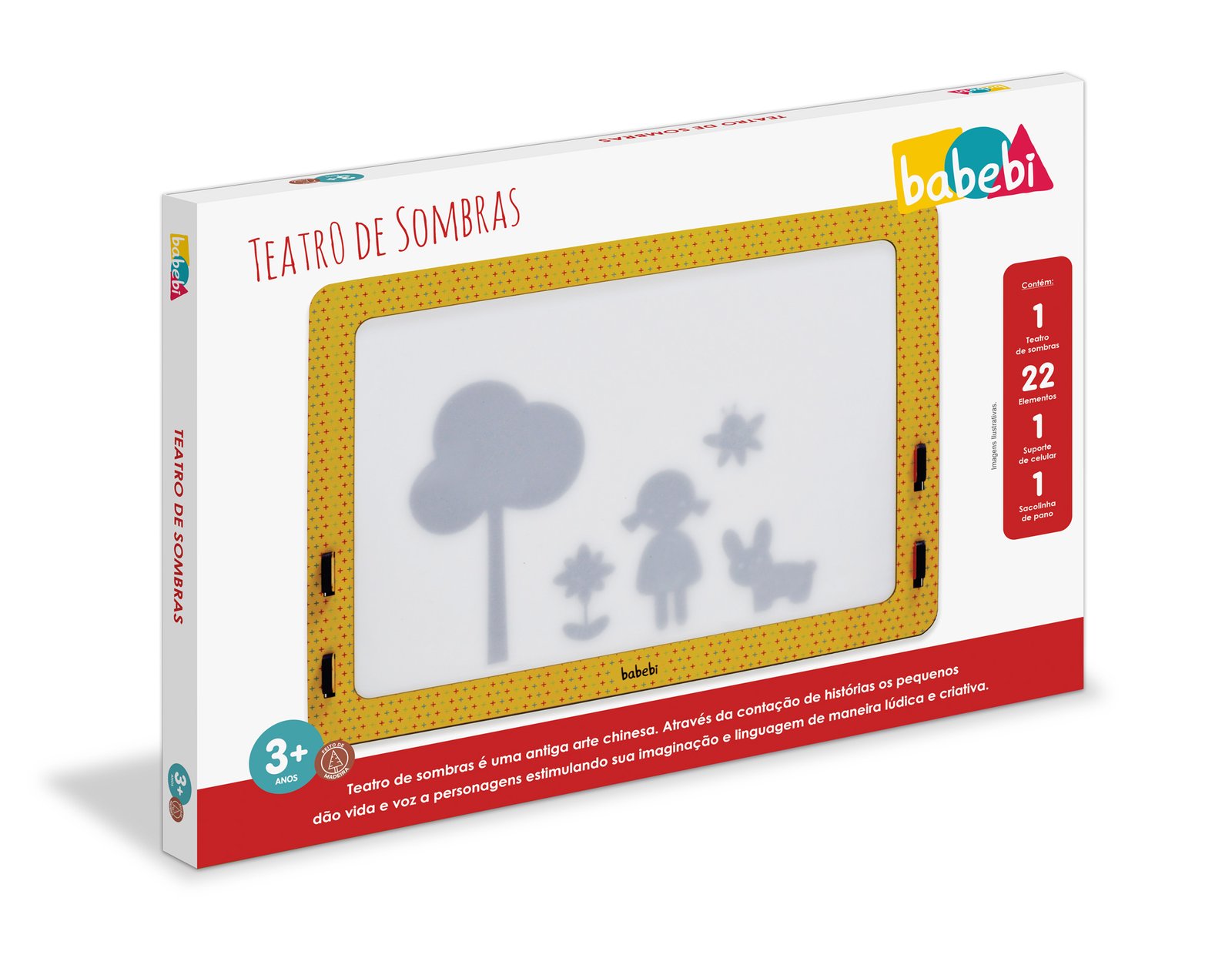Contém 1 teatro de sombras medindo 28 x 39 cm, 22 elementos, 1 suporte de celular e 1 saco de pano. É necessário uma fonte de luz como uma lanterna de celular (não acompanha nesse produto). O efeito pode ser ainda melhor se ambiente estiver com baixa iluminação (luzes apagadas).